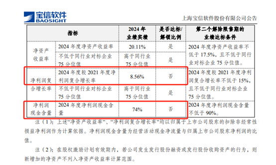 其中,2024年业绩指标中,宝信软件2024年度较2021年度净利润复合增长率、2024年度净利润现金含量等2项指标未达标。